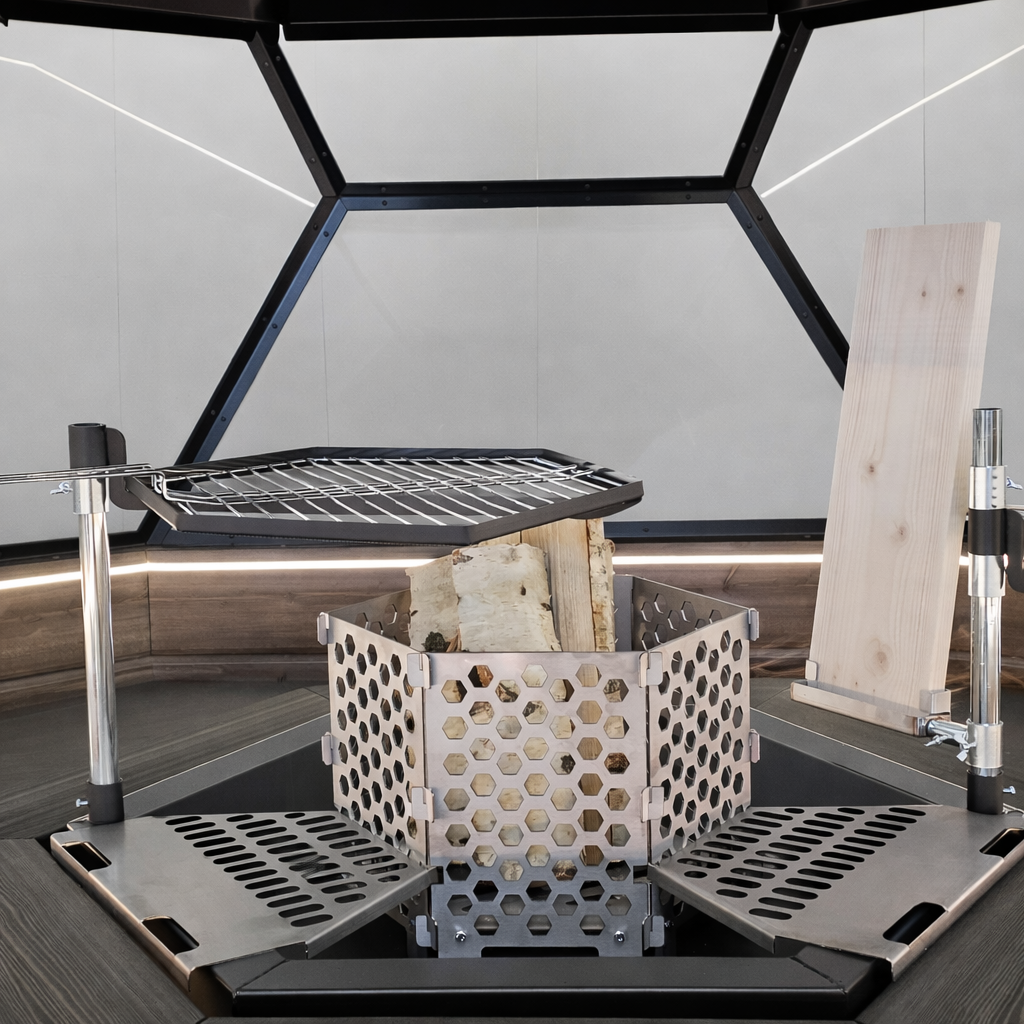 Eldkorgen med stekplattorna är kompatibel med Arctic Laplandsköket. Den fungerar sömlöst som en helhet och möjliggör effektiv förbränning samt praktisk matlagning med hjälp av stekhyllorna.
