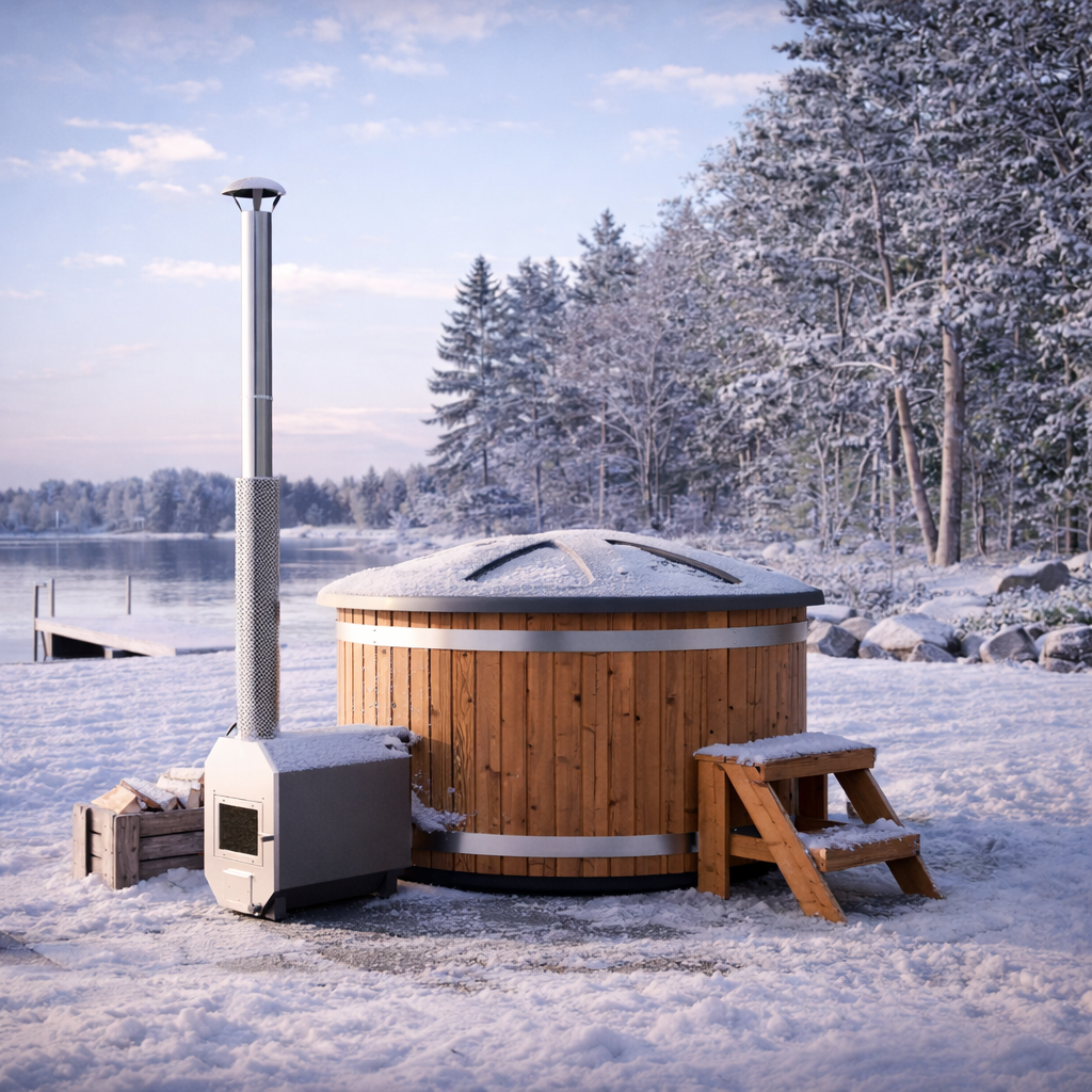Vår effektiva havsaluminium Arctic kamin värmer vattnet till badtemperatur på ett par timmar. Havsaluminiumet i 35 kilowatt kaminen, full av energi, är hållbar och leder värme bra. Eldstaden är försedd med en vacker glasdörr, så att den vedeldad kaminen skapar en hypnotisk eld-dans runt badtunnan och du behöver inte öppna dörren för att kontrollera eldens status.